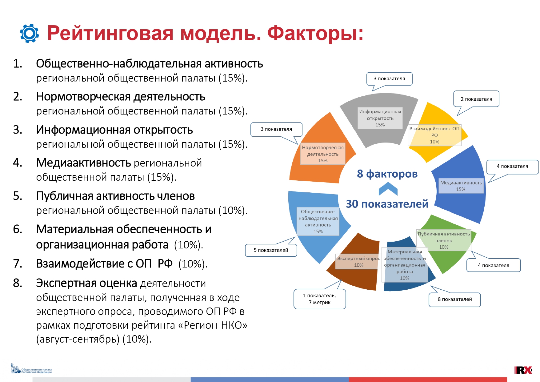 Задача рейтинга – показать, насколько полно общественная палата региона реализует свои функции и полномочия. Рейтинговая модель исследования включает в себя 8 факторов (критериальных групп). Каждый фактор в свою очередь рассчитывается на основе нескольких показателей – в сумме их 30.