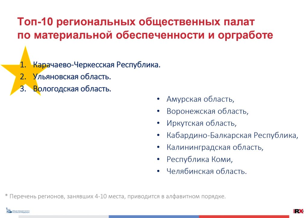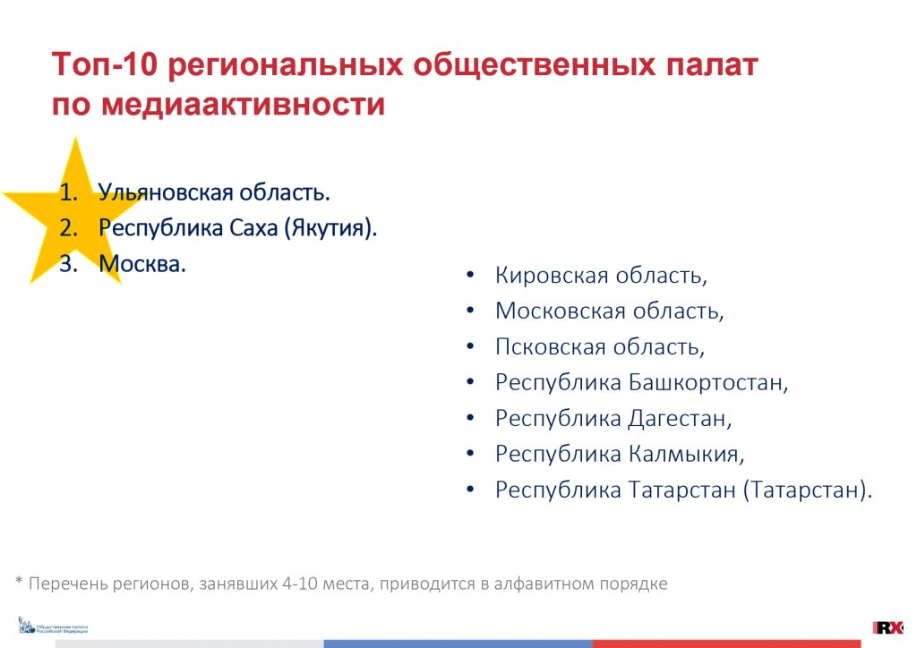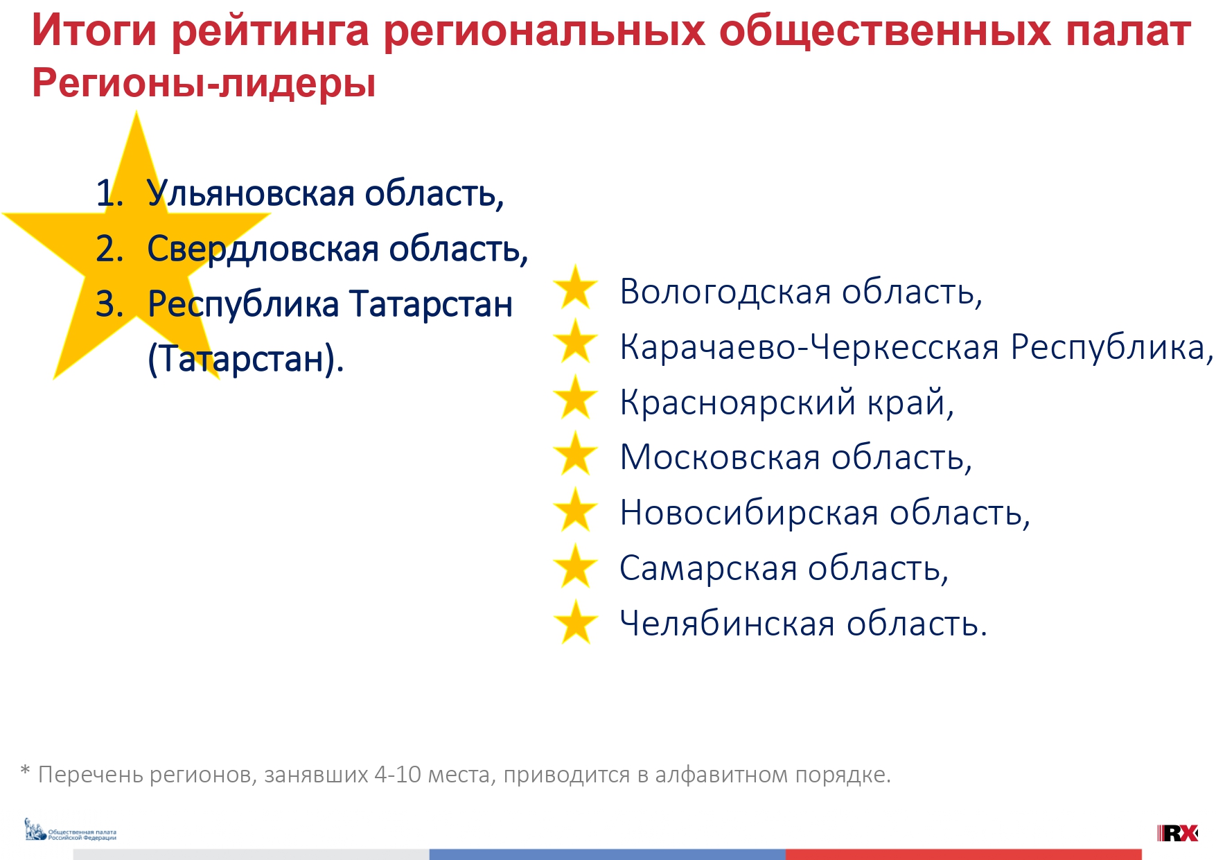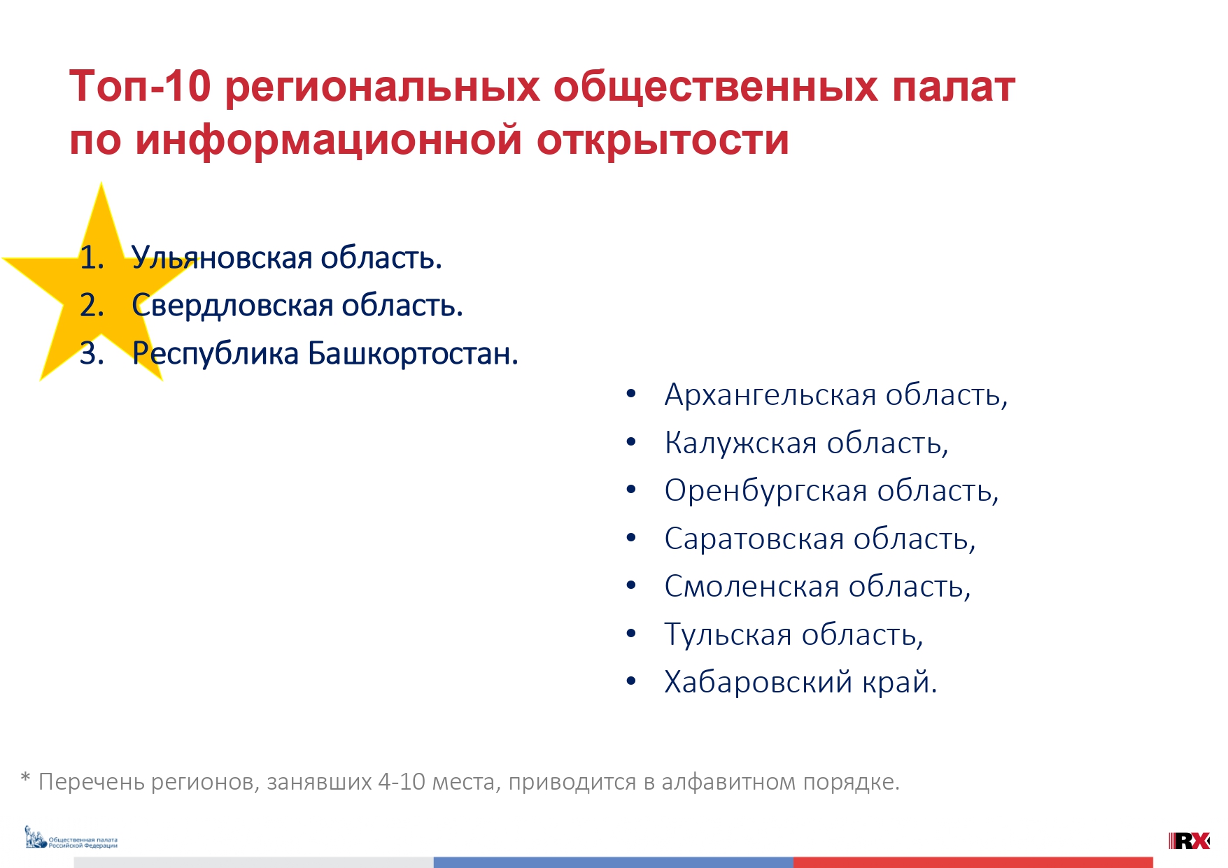 ОБЩЕСТВЕННАЯ ПАЛАТА УЛЬЯНОВСКОЙ ОБЛАСТИ заняла : 1 место в общем рейтинге; 1 место по информационной открытости; 1 место по медиаактивности; 2 место по материальной обеспеченности и организационной работе и вошла в ТОП-10 по итогам экспертного опроса.