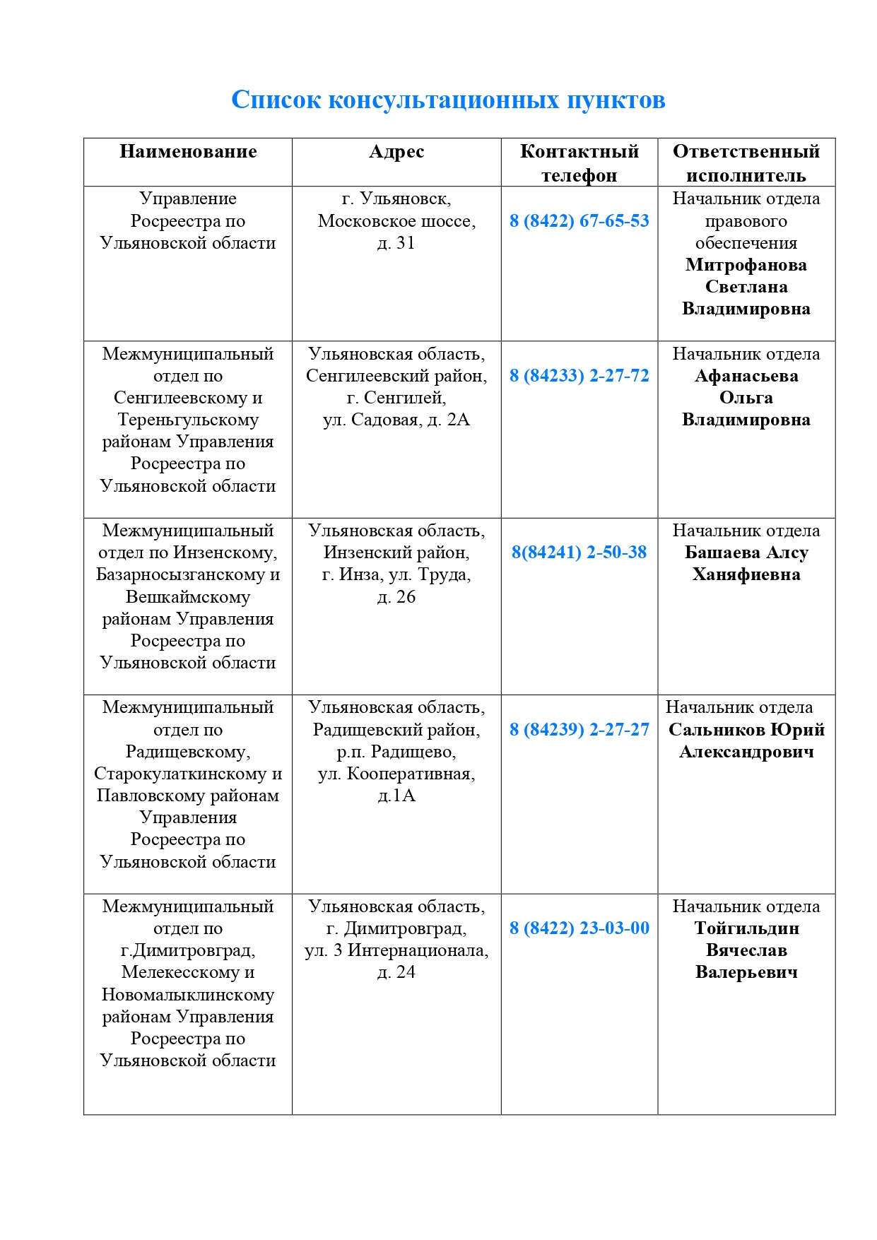 Список консультационных пунктов: