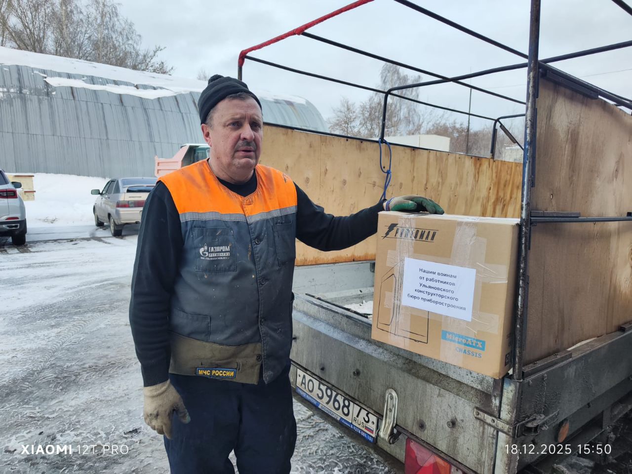 18 декабря 2025 года представители Ульяновского ОРО МОО ветеранов боевых действий «Рубеж» провели гуманитарную акцию по подготовке очередного гуманитарного конвоя. Ветераны получили от руководителя волонтёрской группы «8 Рота» Сергея Варламова полиэтиленовую пленку (один рулон) и коробки с окопными свечами.