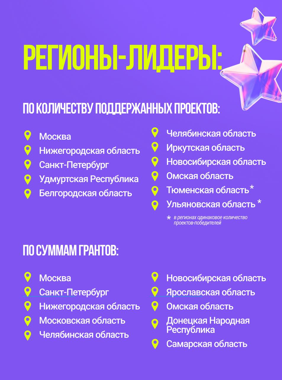 По итогам независимой экспертизы Президентским фондом культурных инициатив будет поддержано 810 проектов из 86 регионов на общую сумму 4 млрд 796 млн рублей. В качестве собственного вклада победители намерены привлечь 6 млрд 440 млн рублей, уровень софинансирования проектов составит рекордные 134%. По количеству поддержанных проектов рейтинг регионов в этом конкурсе возглавляют Москва, Нижегородская область, Санкт-Петербург, Удмуртская Республика, Белгородская область, Челябинская область, Иркутская область, Новосибирская область, Омская область, Тюменская область и Ульяновская область.