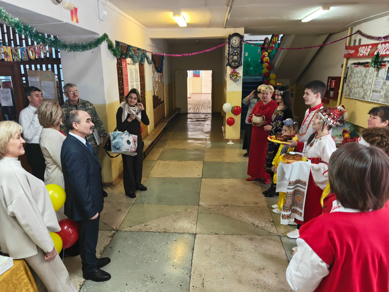 В фойе школы была организована встреча гостей, включающая традиционную церемонию приветствия хлебом и солью. Мероприятие проводилось на четырёх языках: русском, чувашском, татарском и таджикском. Учащиеся школы были одеты в национальные костюмы, отражающие элементы народных традиций. Праздничное мероприятие прошло в актовом зале, украшенном в соответствии с новогодней тематикой.