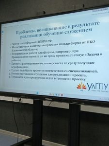 • Ксения Мызрова (доцент кафедры экономики и предпринимательства УлГУ) поделилась результатами внедрения дисциплины «Обучение служением» в образовательный процесс университета.