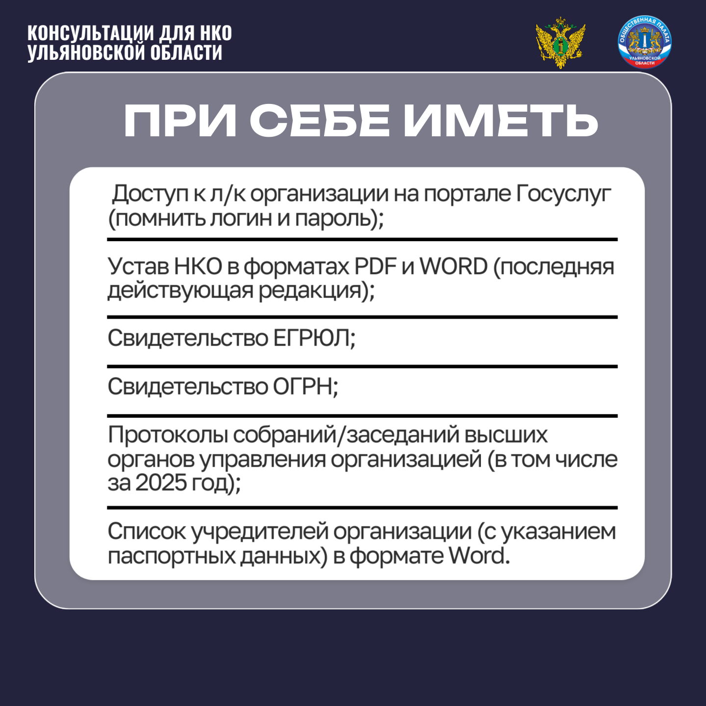 Для продуктивной работы руководителю организации с собой необходимо иметь: Доступ к личному кабинету организации на портале Госуслуг (помнить логин и пароль); Устав НКО в форматах PDF и WORD (последняя действующая редакция); Свидетельство ЕГРЮЛ; Свидетельство ОГРН; Протоколы собраний/заседаний высших органов управления организацией (в том числе за 2025 год); Список учредителей организации (с указанием паспортных данных) в формате Word.