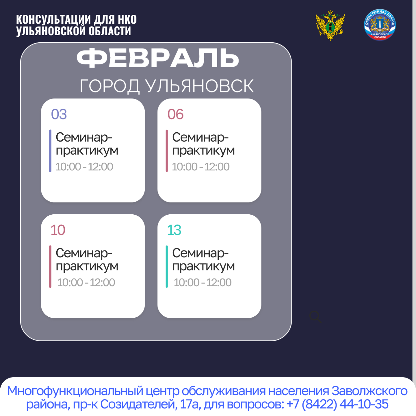 В связи с вступлением в силу приказа Министерства Российской Федерации от 09.12.2025 № 336 «Об отчетности некоммерческих организаций», Общественная палата Ульяновской области совместно с Управлением Минюста России по Ульяновской области объявляет о проведении серии кустовых семинаров-практикумов.